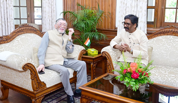 रांची/डेस्क: मुख्यमंत्री हेमंत सोरेन ने शुक्रवार को लोकभवन में राज्यपाल संतोष कुमार गंगवार से शिष्टाचार मुलाकात की. इस मुलाकात के दौरान सीएम हेमंत ने राज्य के विकास, जनकल्याणकारी योजनाओं और अन्य समसामयिक विषयों पर राज्यपाल से विस्तृत विचार-विमर्श किया. भेंट के क्रम में मुख्यमंत्री ने राज्यपाल को राज्य के विकास एवं जनकल्याणकारी योजनाओं के क्रियान्वयन की स्थिति से भी अवगत कराया.
