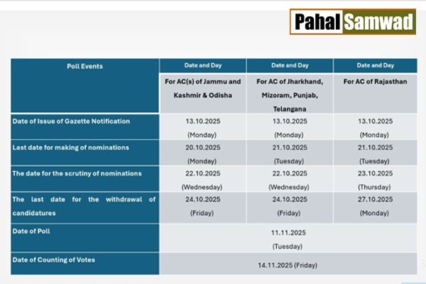 झारखंड के पूर्वी सिंहभूम जिले की घाटशीला (ST) विधानसभा सीट पर उपचुनाव की तारीखों का ऐलान कर दिया गया है। भारत निर्वाचन आयोग (ECI) के अनुसार, मतदान 11 नवंबर 2025 को होंगे, जबकि मतगणना 14 नवंबर को की जाएगी।